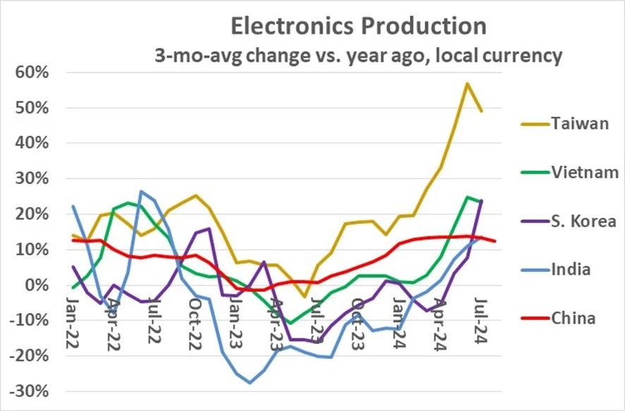 相較于其他亞洲新興經(jīng)濟體,眾多亞洲發(fā)展中國家與地區(qū)的電子產(chǎn)品制造業(yè)正見證著顯著的增勢。其中中國臺灣和韓國,展現(xiàn)出蓬勃的新興態(tài)勢,尤其自2023年中期以來,生產(chǎn)活動呈現(xiàn)出積極的回升跡象。